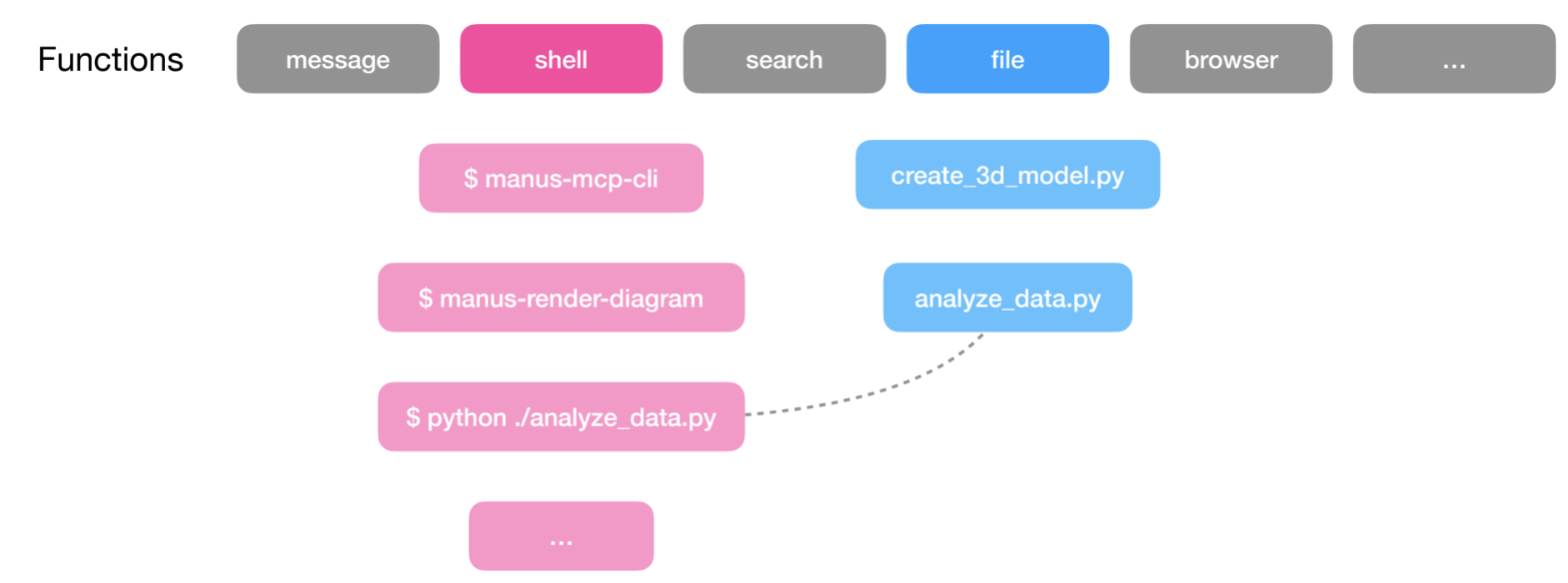 Rather than bloating the function calling layer, Manus offloads most actions to the sandbox layer. Manus can execute many utilities directly in the sandbox with its Bash tool and MCP tools are exposed through a CLI that the agent can also execute using the Bash tool.