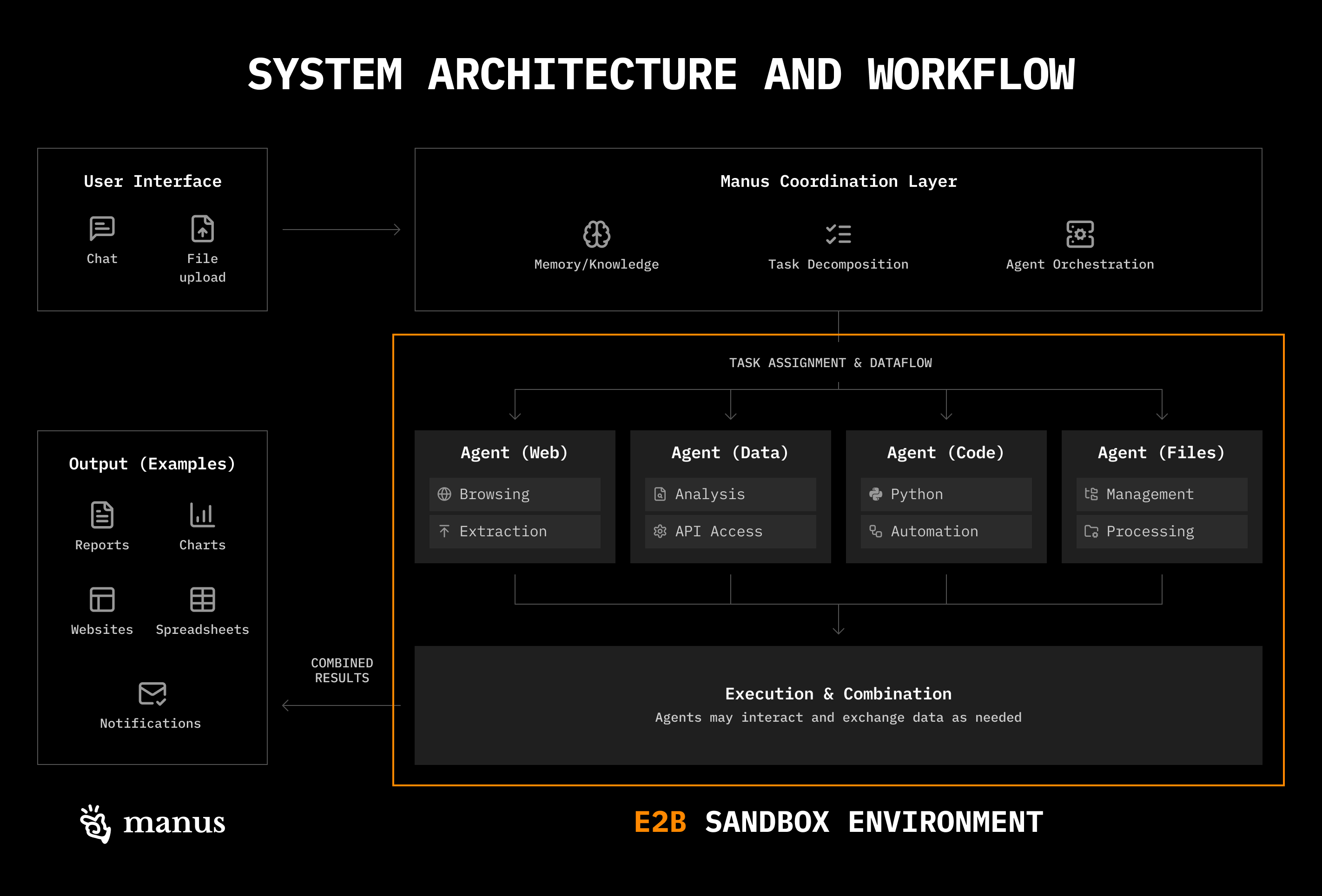 Each Manus session uses a dedicated cloud-based virtual machine, giving the agent a virtual computer with a filesystem, tools to navigate it, and the ability to execute commands (e.g., provided utilities and standard shell commands) in that sandbox environment.
