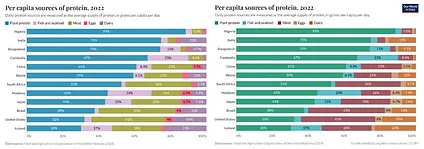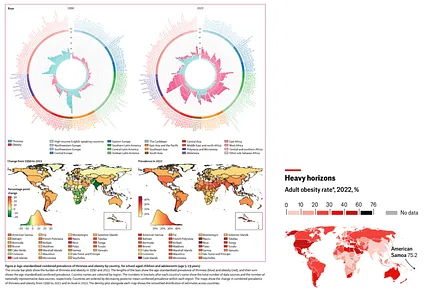A comparison of two visualizations of the same data on the adult obesity rate. Left: an academic chart. Right: a journalistic chart. Sources: NCD Risk Factor Collaboration (2024); The Economist (2024).