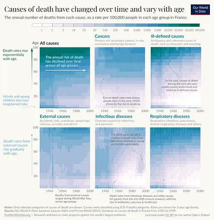 A heatmap on a Lexis plot. This visualization allows you to see how death rates (colours) changed over time (x axis) across age groups (y axis). Source: Causes of death topic page, by me on Our World in Data.