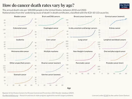 Line chart showing the difference in death rates with age. Source: How does the risk of death change as we age ā and how has this changed over time? by me on Our World in Data.