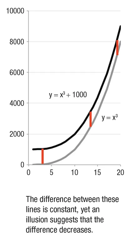 A visual illusion where the difference between two lines appears to decrease as they get steeper. The reason is probably that people are noticing the shortest distance between the two lines, instead of the vertical difference between the two lines. Source: The science of visual data communication: what works. Steven L. Franconeri, Lace M. Padilla, Priti Shah, Jeffrey M. Zacks, and Jessica Hullman (2021).
