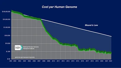 Caution aside, here are two of the most memorable charts Iāve seen. One is a chart showing the enormous decline in the cost of genome sequencing ā a much faster decline than Mooreās law ā which has enabled tons of biological research and diagnostics and some treatments too.
