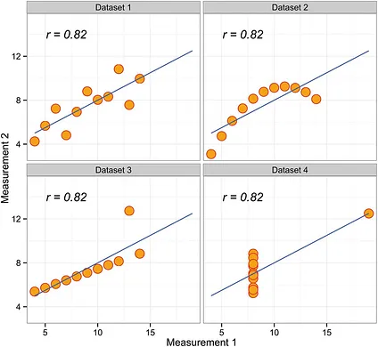 Four datasets that have the same correlation between two variables, despite having very different underlying patterns. Source: Hickey et al. (2015) ultimately from F J Anscombe (1973).