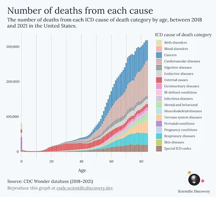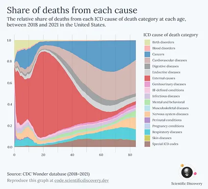 There were many ways to go about visualizing this. I could show the number of deaths from different causes across ages, the death rate from different causes across ages, or the relative share of deaths from different causes across ages, for example.