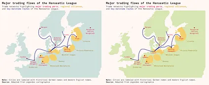 A comparison of two maps showing the major trading flows of the Hanseatic League made by me. Left: the landmasses are confusingly coloured in blue. Right: the landmasses are now coloured in green. Source: The rise and fall of the Hanseatic League (Agree Ahmed, 2025).