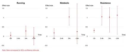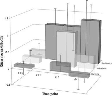 After youāve finished being distracted by the totally unnecessary three-dimensional aspect of the graph, youāll probably note that there is a large effect size on āresistanceā. And something is happening to āmetabolicā at 24 hours.