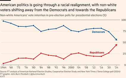 A line chart of non-white Americansā voting intentions in presidential elections over time. Source: American politics is undergoing a racial realignment, by John Burn-Murdoch in the Financial Times.