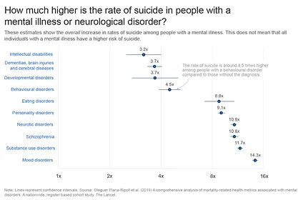 But there are two more problems. One is that the graph itself is often kind of alarming; seeing that the risks of suicide are so much higher with a diagnosed mental illness, even though the absolute risk may be low, and the vast majority of people diagnosed donāt die by suicide.