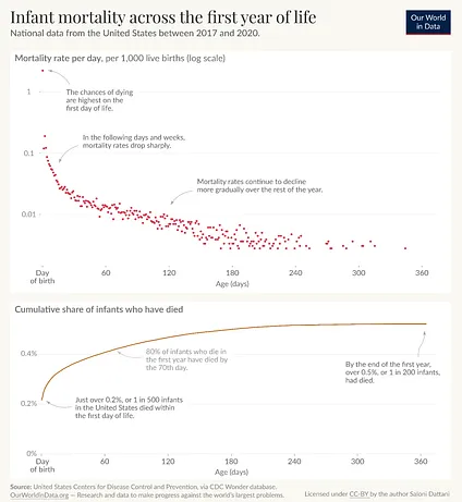 A dot plot showing the infant death rate per day, across the first year of life, and a line chart showing the cumulative share of infants who have died by a given number of days. Source: How does the risk of death change as we age ā and how has this changed over time? by me on Our World in Data.