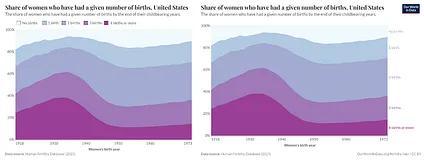 A comparison of charts on the share of women who have had a given number of births. Left: the categories are in a separate legend. Right: the categories are directly labelled next to the data. Source: Share of women who have had a given number of births, United States. Data comes from the Human Fertility Database via Our World in Data.
