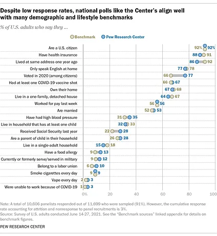 A dot plot showing the share of people in Pewās surveys who respond saying they are part of each demographic, compared with benchmark shares from censuses and registries. Source: Does public opinion polling about issues still work? (Courtney Kennedy, Andrew Mercer, Nick Hatley, and Arnold Lau on Pew Research Center, 2022).