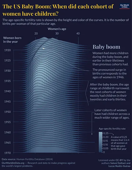 A ridgeline plot showing the US baby boom. Each curve represents a birth cohort of women. The height and colour at each age shows the fertility rate of women at a given age. Source: The baby boom in seven charts, by me and Lucas RodƩs-Guirao on Our World in Data.