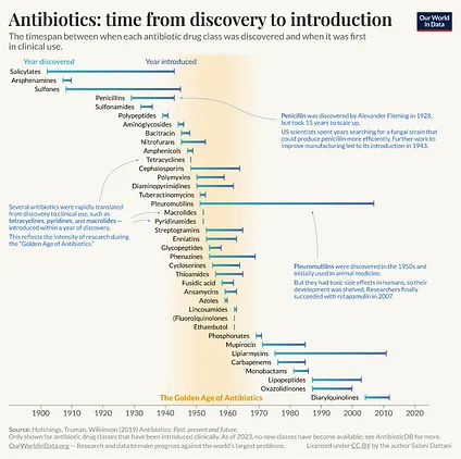 Range plot showing the time from the discovery of new antibiotic drug classes to their introduction in medical use. Source: What was the Golden Age of Antibiotics, and how can we spark a new one? by me on Our World in Data.