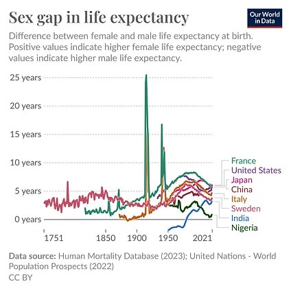 After reading much more on the topic, I learnt that the growing gap was driven by the rise of smoking, especially among men, which raised the risks of various cancers and heart disease and early mortality. I ended up writing a whole article about it ā the causes of the sex gap in life expectancy and how it has changed over time and varies around the world.