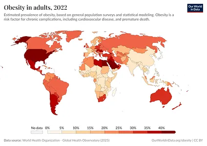 A choropleth map of obesity rates in adults. Source: Global Health Observatory via Our World in Data.