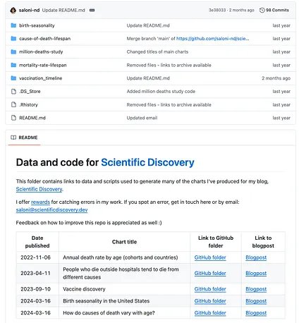 Sadly I donāt know how to make that happen and Iām quite busy with other work, so my current best alternative is to include a link on my charts (as you can see below) which takes you to my GitHub repository, where you can find a folder with each chart, the data, an explanation, and the code to reproduce it. [You can also find the code for charts Iāve made for this newsletter on the āCodeā tab at the top of this page, or for the charts I produced at Our World in Data, find the code here.]
