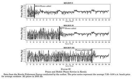Fish prices were very volatile before, but became much more stable as fishermen could share information much more easily. The idea is that, with phones, they no longer had to guess which harbour would offer the best price or risk arriving somewhere already oversupplied. Instead, they could call ahead, coordinate with buyers, and spread out across markets. Here is a link to the study it comes from, in case you are interested.