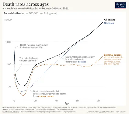 Below is another example. It shows death rates across ages. You can see the trend looks like a hook, which might be surprising. To explain why it has this shape, Iāve split the data into two components: the rates of dying from diseases vs the rates of dying from external causes (which include accidents, injuries, violence, and so on).