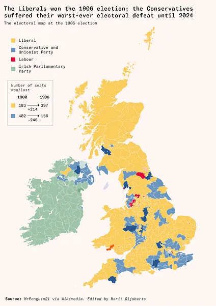 An electoral map of the United Kingdom in the 1906 election. Source: The failure of the land value tax (Samuel Watling, 2025).